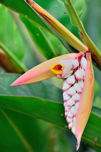 月桃花於每年5~7月間盛開,是白波紋小灰蝶的食物之一,其花蜜稱之為月桃蜜,有獨特香味,花朵本身經烘乾處理加工處理後,可作為食品。 端午節前後正是月桃盛開時,欲賞月桃花可到郊野淺山,它的花可要近近地看,看它的瓣裡吐出黃唇的美妙,花朵極易凋落,不適合取回家當插飾。